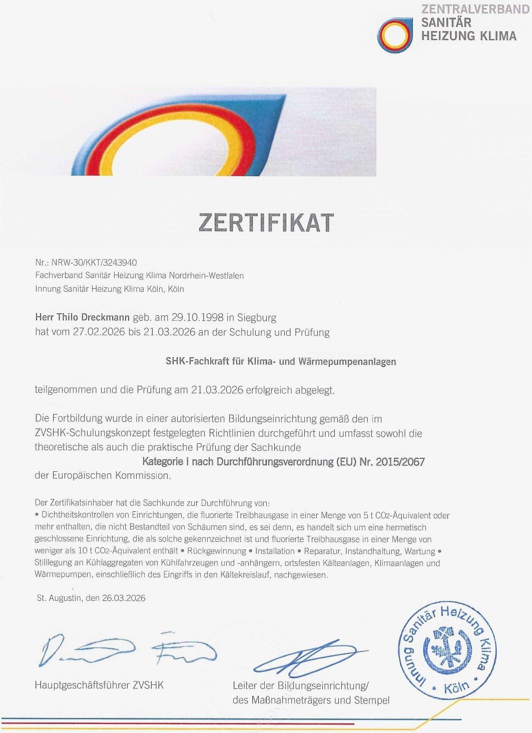 Thilo Dreckmann hat seine Fachkenntnisse im SHK-Bereich (Sanitär, Heizung, Klima) erfolgreich erweitert. Damit konnte das Leistungsangebot nun um weitere zukunftsweisende Dienstleistungen ergänzt werden – für noch umfassendere Lösungen aus einer Hand.